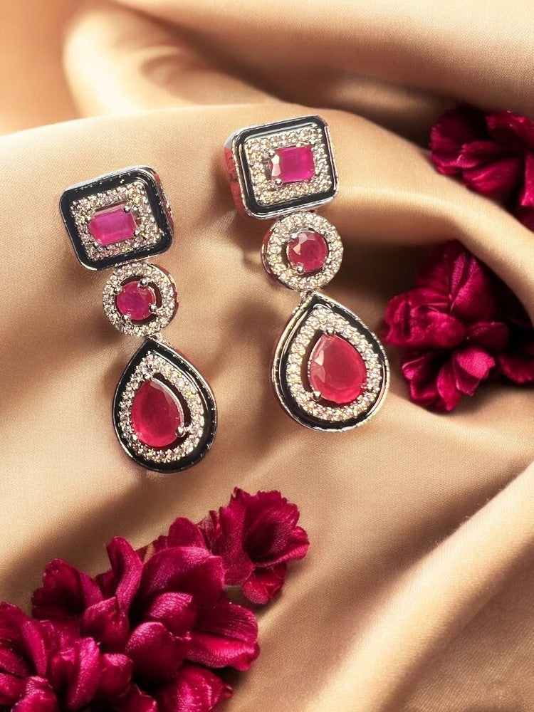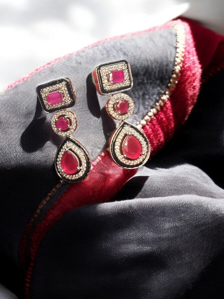 A cute, medium-sized sleek golden dangler with a Ruby stone can be a stunning statement piece. The richness of Ruby beautifully contrasts with the warm gold, making it perfect for adding a pop of color to a simple outfit or elevating a more formal look.